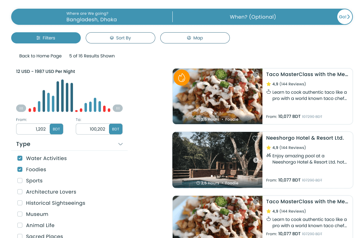 A minimalist search interface with categorized listings and flexible filters makes finding your perfect travel option a breeze.